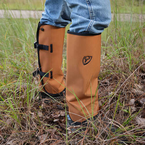 These snakeproof gaiters provide full protection below the knee. Constructed of a durable poly-cotton blend fabric and treated with a patented laminating process to make these gaiters tough, yet quiet when walking. Two adjustable, quick-release buckle closures and comfortable contour design keep gaiters securely in place. One-size-fits-all calf.