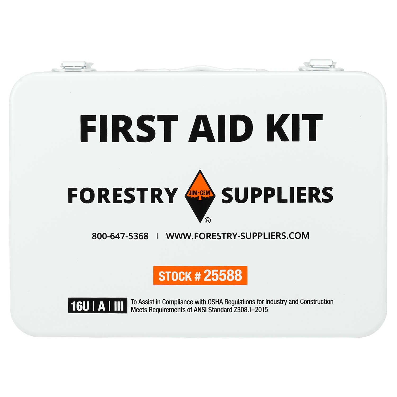 Our unitized first aid kits divide medication, creams, and bandages into individual, pre-measured units, taking the guesswork out of how much gauze wrap or first aid cream a wound may require. When there’s a minor accident, simply use one of whatever you need, whether it’s one tube of burn cream, one antiseptic towelette, or one adhesive bandage. These smaller units of first aid supplies are conveniently grouped and packaged into larger, color-coded boxes, simplifying identification and inventory upkeep. The larger boxes are wrapped in clear plastic and stored in a rugged, weatherproof metal case to keep contents fresh and dry. Each case is wall mountable and features a convenient carrying handle. Contents: 1 Fabric Bandages, 1˝ x 3˝, Box of 16; 1 First Aid Tape/1 CPR Mask/1 Scissors; 1 Triple Antibiotic Ointment Packets, Box of 12; 1 BZK Antiseptic Towelettes, Box of 10; 1 Burn Dressing, 4˝ x 4˝; 1 First Aid/Burn Cream, 0.9g Packets, Box of 12; 1 Cold Compress, 4˝ x 5˝; 1 Eyewash (1 oz.) with 2 Eye Pads and 2 Strips; 1 Hand Sanitizer, 0.9g Packets, Box of 10; 4 Nitrile Exam Gloves; 1 Conforming Gauze Roll, 2˝ x 4 yds., Box of 2; 1 Gauze Dressing Pads, 3˝ x 3˝, Box of 4; 2 Trauma Pads, 5˝ x 9˝; 1 Triangular Sling/Bandage, 40˝ x 40˝ x 56˝; 1 First Aid Guide.