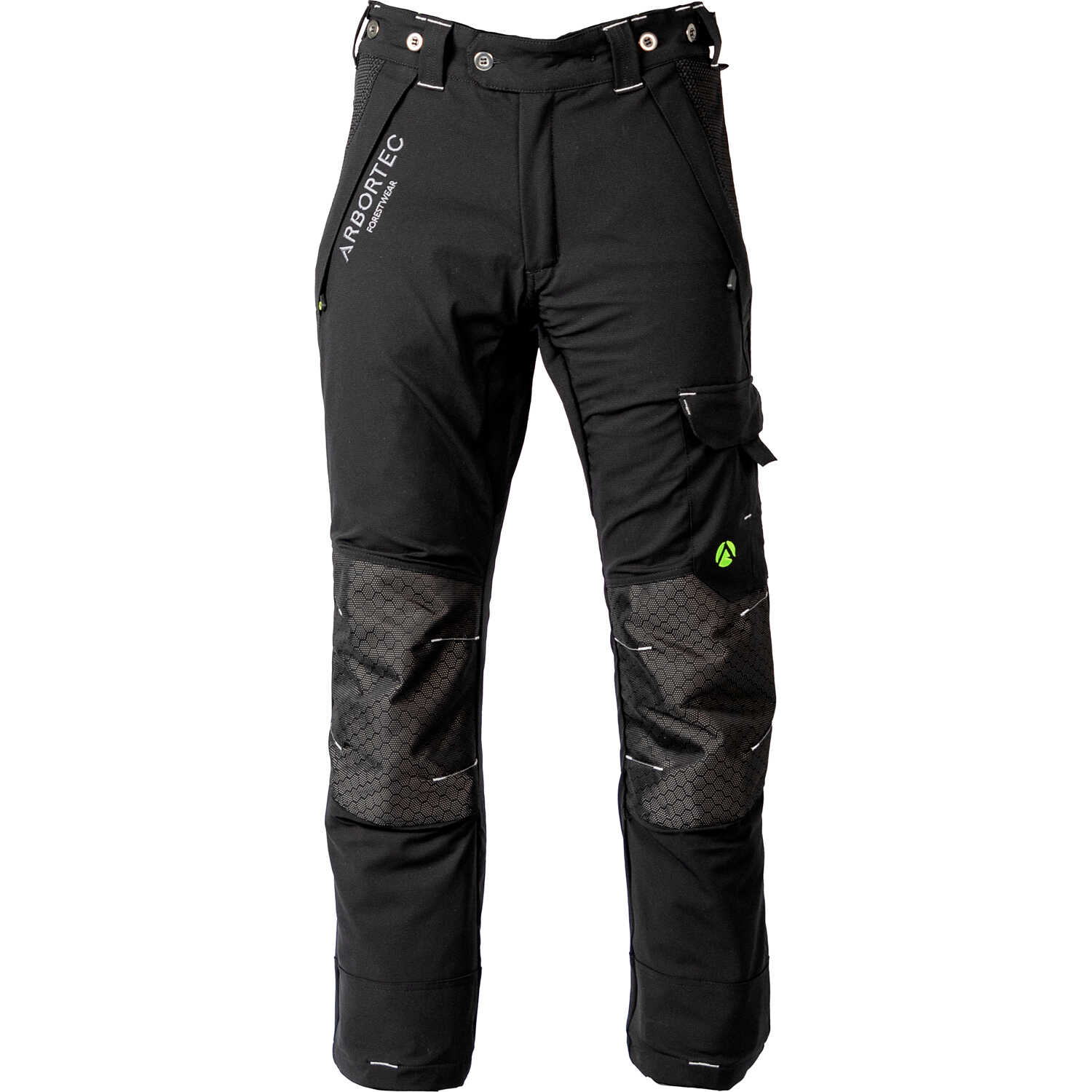 Combining excellent breathability and comfort, these chain saw trousers feature four large ventilation panels that are strategically placed on the front and back to maximize airflow and keep you cool. Kevlar knee reinforcement provides extra abrasion resistance, and reinforced seams in high-stress areas ensure added strength. Storage includes a cargo pocket, front pockets, and a back pocket. Downward-facing zippers on the pockets allow for easy access to contents when you're wearing a climbing harness. An adjustable waistband with a high back delivers extra coverage and a comfortable, tailored fit. Elasticated hooks at the bottom of the trousers allow for attachment to boot laces to keep out debris. Conforms to ASTM F1897-20 (2020).