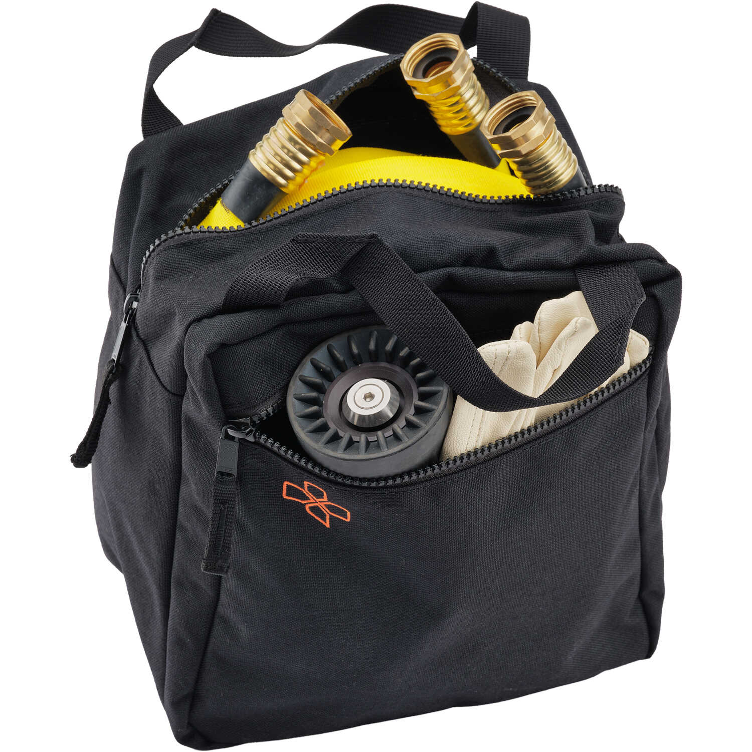 Ideal for carrying 3/4˝ fire hoses, nozzles, fittings, and accessories, this heavy-duty bag is a must-have when staging for an initial attack, mopping up, or packing out after a shift. Storage includes a main compartment with a wide zippered opening for fast access, a zippered side pocket, and exterior tool handle webbing loops. Made from rugged, abrasion-resistant, weather-resistant material. Dimensions: 9.5˝ x 9.5˝.