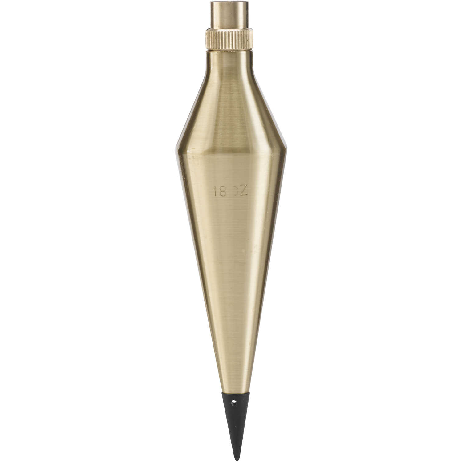 Brass plumb bob. Screw cap and hardened steel point with standard threads. Storage space for a spare point inside the cap.