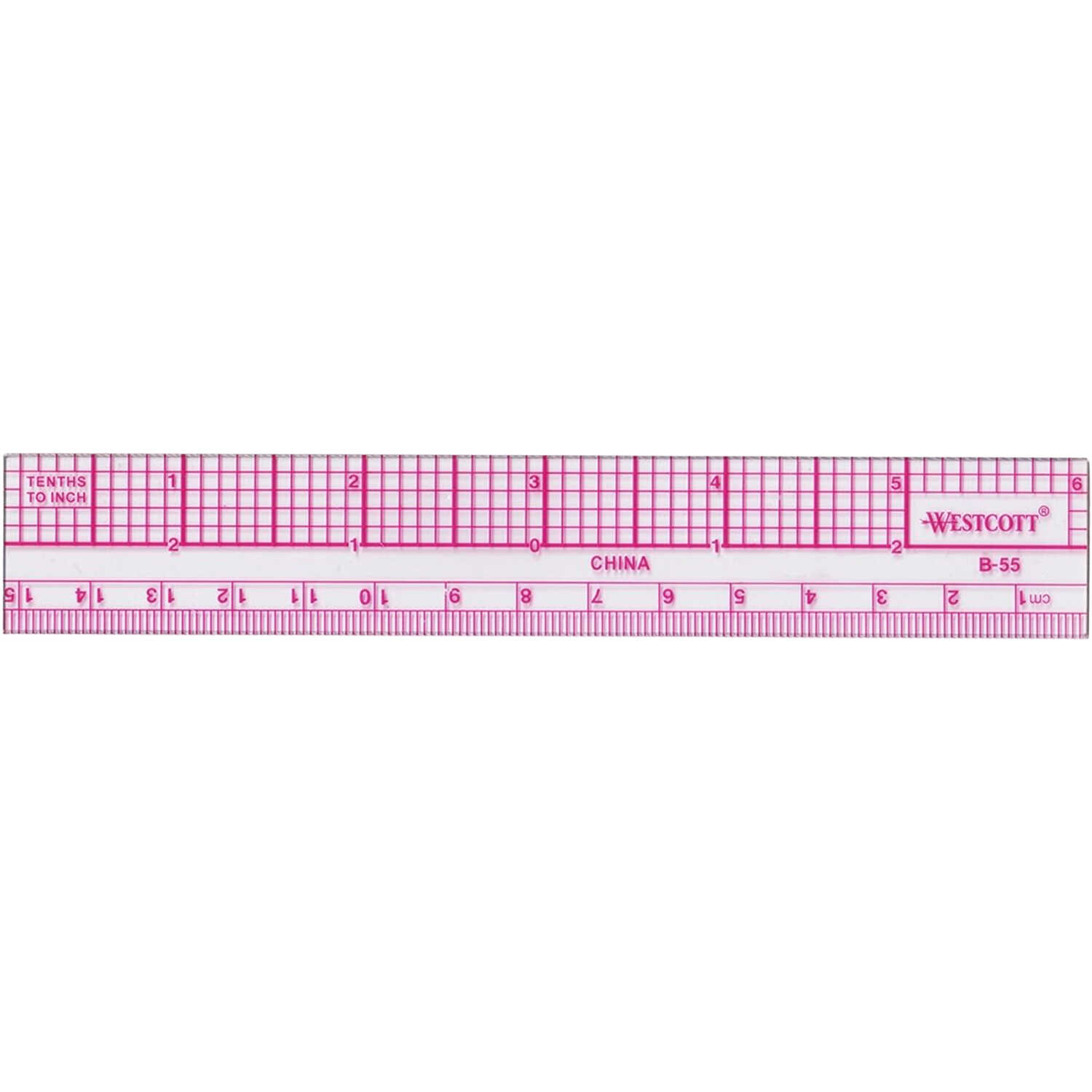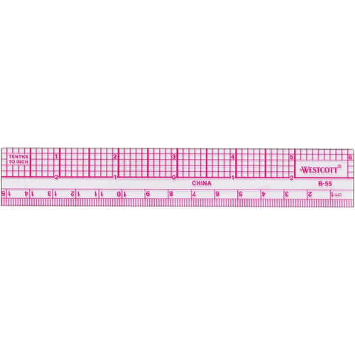 Ruler has mm and cm one edge, inches and 10ths other edge. Plastic.