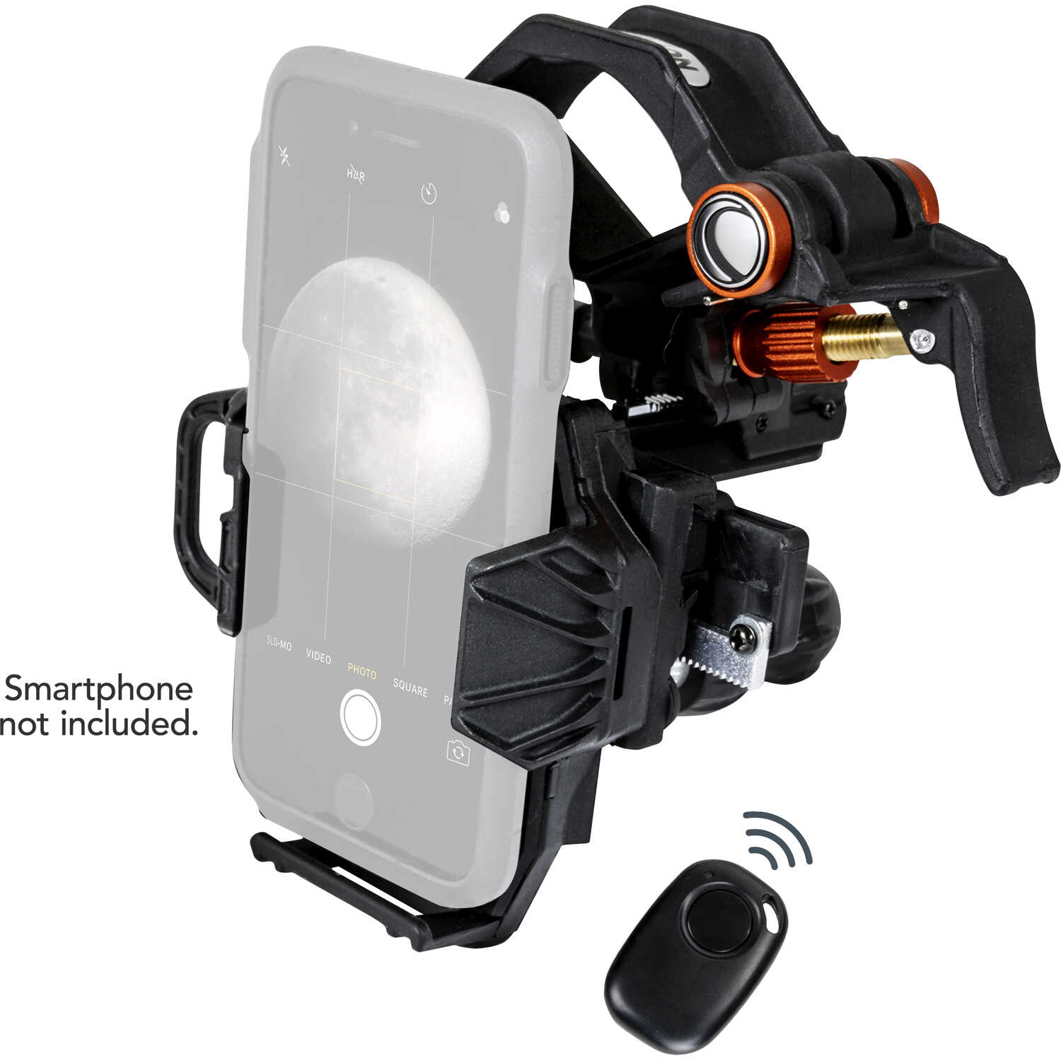 Everything you need to capture sharp, detailed images and video. Fits any eyepiece from 35mm to 60mm in diameter, including telescopes equipped with 1.25” or 2” eyepieces. Also attaches to microscopes using an included adapter ring. Fits most smartphones, and is fully adjustable to accommodate cases. Durable construction and materials can withstand the weight of heavier devices with ease, thanks to NexYZ’s strong metal spring and threaded twist lock. To capture the best images, the NexYZ includes a Bluetooth shutter release remote, which allows you to trigger the camera’s shutter on any Android or iOS smartphone without touching the device, eliminating shaking, vibration and out-of-focus images. Pairing the remote to your smartphone takes only seconds. NexYZ gives you the power to place your phone on the platform and fine-tune the center over the eyepiece until you have the entire field of view in your shot. Switching phones, eyepieces, or optical instruments requires only slight adjustments to re-center the camera over the new eyepiece. You can also switch your image from portrait to landscape simply by turning the eyepiece clamp and readjusting the axis points to realign your phone. Includes 2x Adapters for microscope eyepieces, Bluetooth shutter release remote, CR-2032 battery.