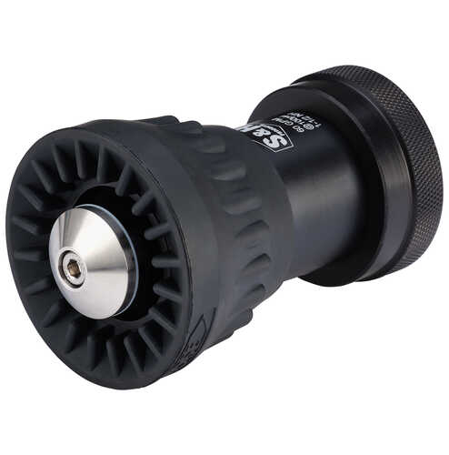 Constructed of hard coated aluminum with brass and stainless steel internal components. A bumper provides protection and makes stream selection easy. The bumper is equipped with teeth which gives a more solid fog pattern than standard nozzles. Adjustable to straight stream, fog patterns, and to on/off position. Ideal for any application of 100 GPM or less, including wildland firefighting, industrial fire protection, fire department use, and industrial wash down applications. Designed to meet or exceed U.S. Forest Service GSA standards (Mil-I-45208).