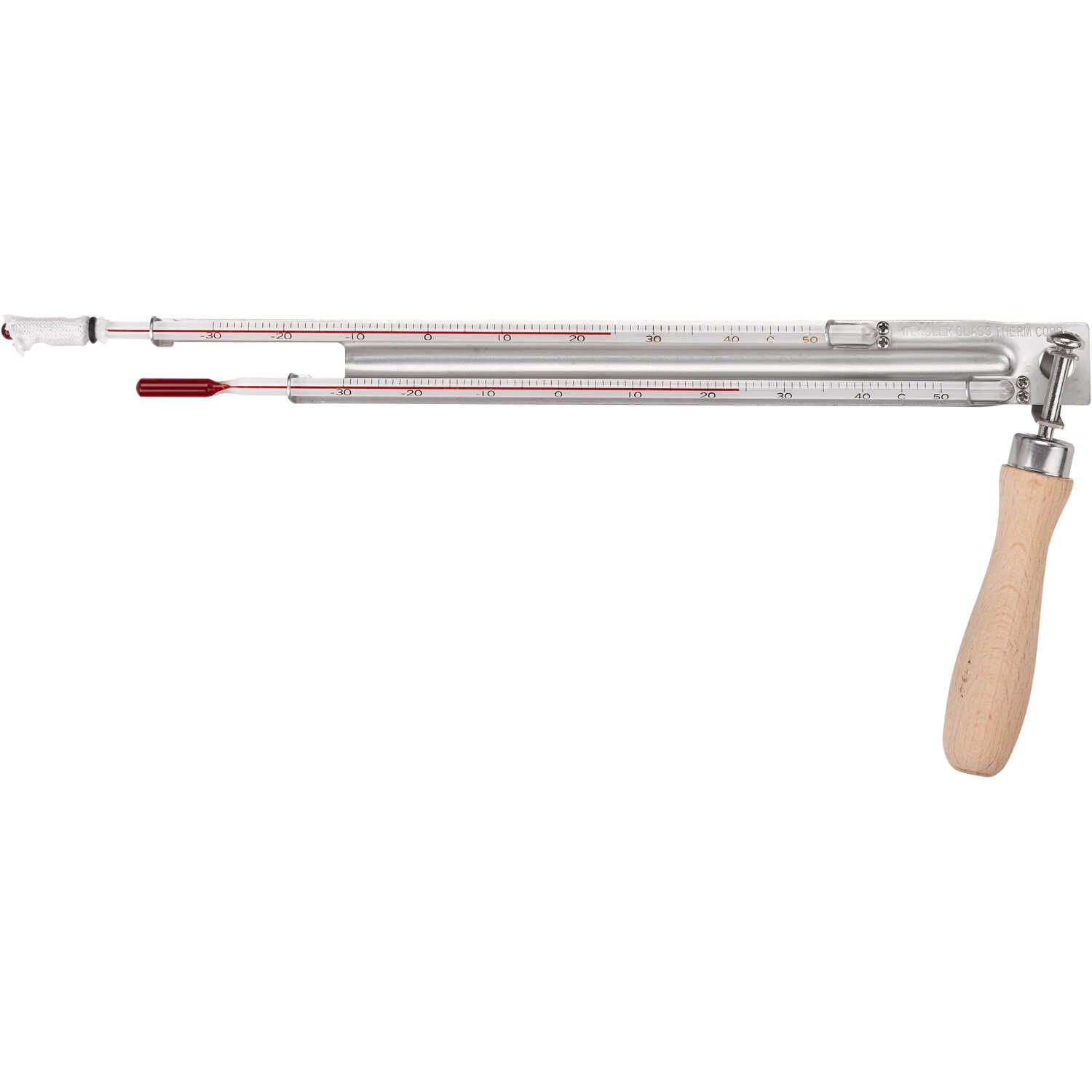 U.S. Weather Bureau Type – two 9-1/2” long, carefully matched thermometers on a stainless steel back. 1° Graduations. Hardwood swivel-type handle. Furnished with wick. Red alcohol. Note: Slide rule not included.