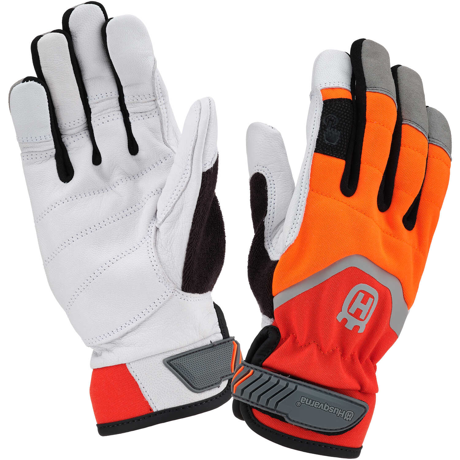These gloves combine a durable goat leather palm with interlock jersey, gray foam, and laminated spandex fabric. Comfortable seams with double thumb stitching. Terry cloth thumb for wiping nose and face. Reinforced trigger finger. Reflective piping provides visibility in dim conditions. Hook/loop adjustment for a secure fit. Saw protection Class 1, 20 m/s according to EN 381-7. Approved according to EN 388 Cat II.