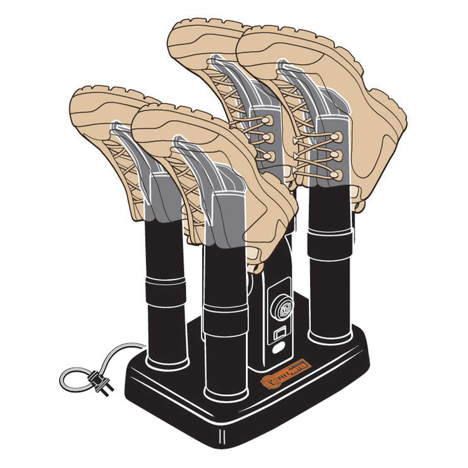 Removes wet and sweat faster, providing the ultimate in double-duty express drying! Patented PEET® DryPorts™ circulate air with a fan for thorough drying (dries most items in 1-3 hours depending on saturation of item). Ionization technology eliminates bacteria and other contaminants that cause odor, skin irritation and deterioration of materials. Choice of heat/no-heat drying and timing. Large, sturdy base handles even two pair of large, heavy boots. Ideal for all types of materials including leather, PVC, rubber, neoprene, canvas, synthetics, cloth, fleece, felt, micro and all modern fabrics. Comes with four (4) Footwear DryPorts to dry two pairs at once. Made in USA.