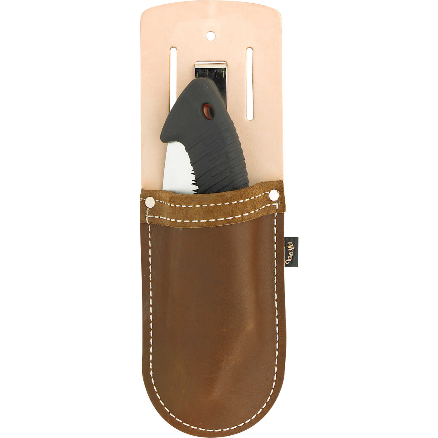 This top grain steer hide leather pouch features a pliable, 3-1/4” x 7” soft brown oil tanned front and a 12-1/4” back. Use the 2” clip on the back for quick attachment to a belt or the 2” slots to slide the belt through instead. The pouch is lockstitched and riveted for superior strength and features nickel plated hardware. Accommodates saws measuring 7” to 10” (folded length).